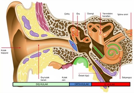 Şekil 1. Normal bir kulak yapısı. Östaki tüpü orta kulak ile geniz arasında bağlantı sağlayan tüp veya boru şeklinde bir yapıdır ve orta kulak havalanmasında çok önemli rol oynar.